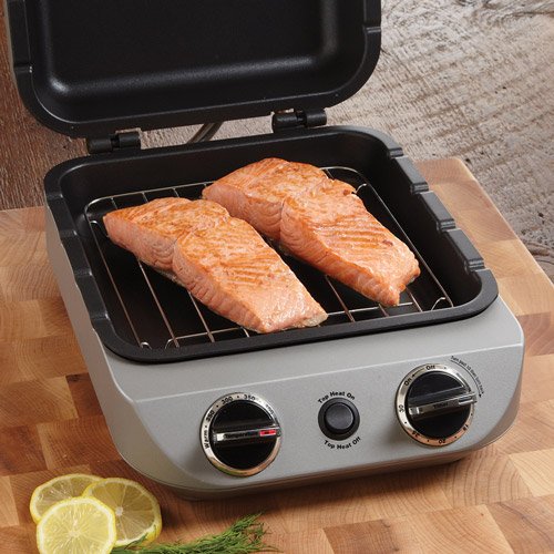 - Dishwasher-safe cooking accessories include baking pan, 4-slot cupcake/muffin pan, roasting/steaming rack and 4 skewers